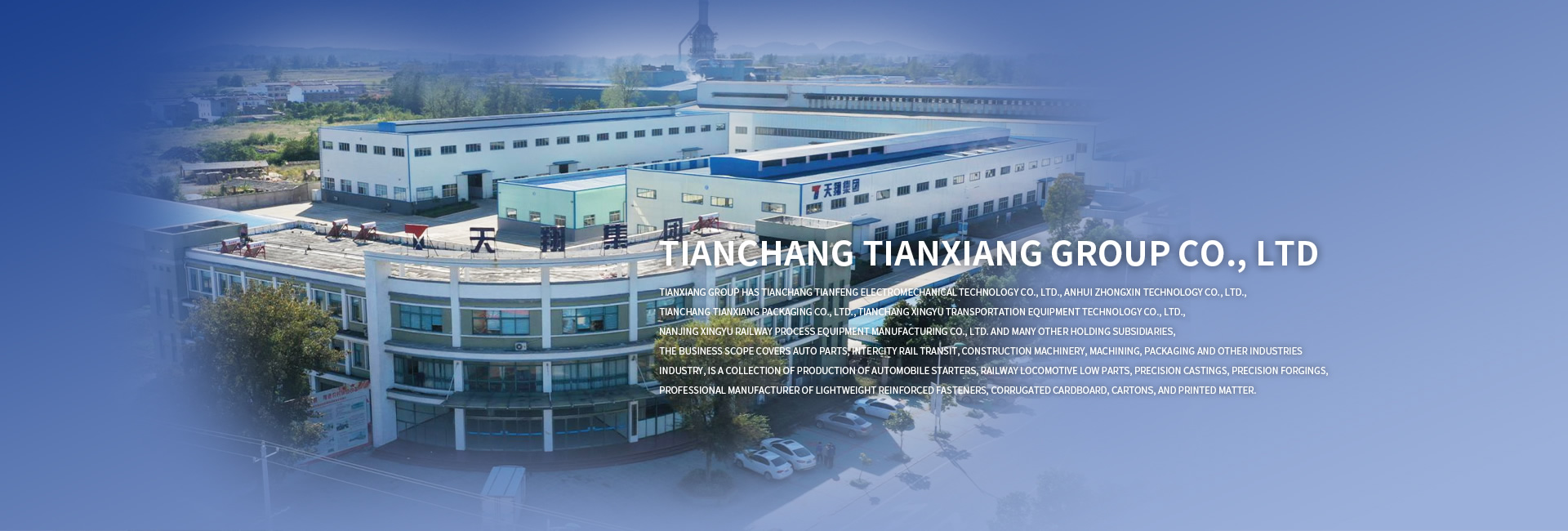 Tianxiang Group was founded in 1998, the group has Tianchang Tianfeng Electromechanical Technology Co., Ltd., Anhui Zhongxin Technology Co., Ltd., Tianchang Tianxiang Packaging Co., Ltd., Tianchang Xingyu Transportation Equipment Technology Co., Ltd., Nanjing Xingyu Railway Process Equipment Manufacturing Co., Ltd. and many other holding subsidiaries, business scope covers auto parts, intercity rail transit, construction machinery, machining, packaging and other industries, is a¡
